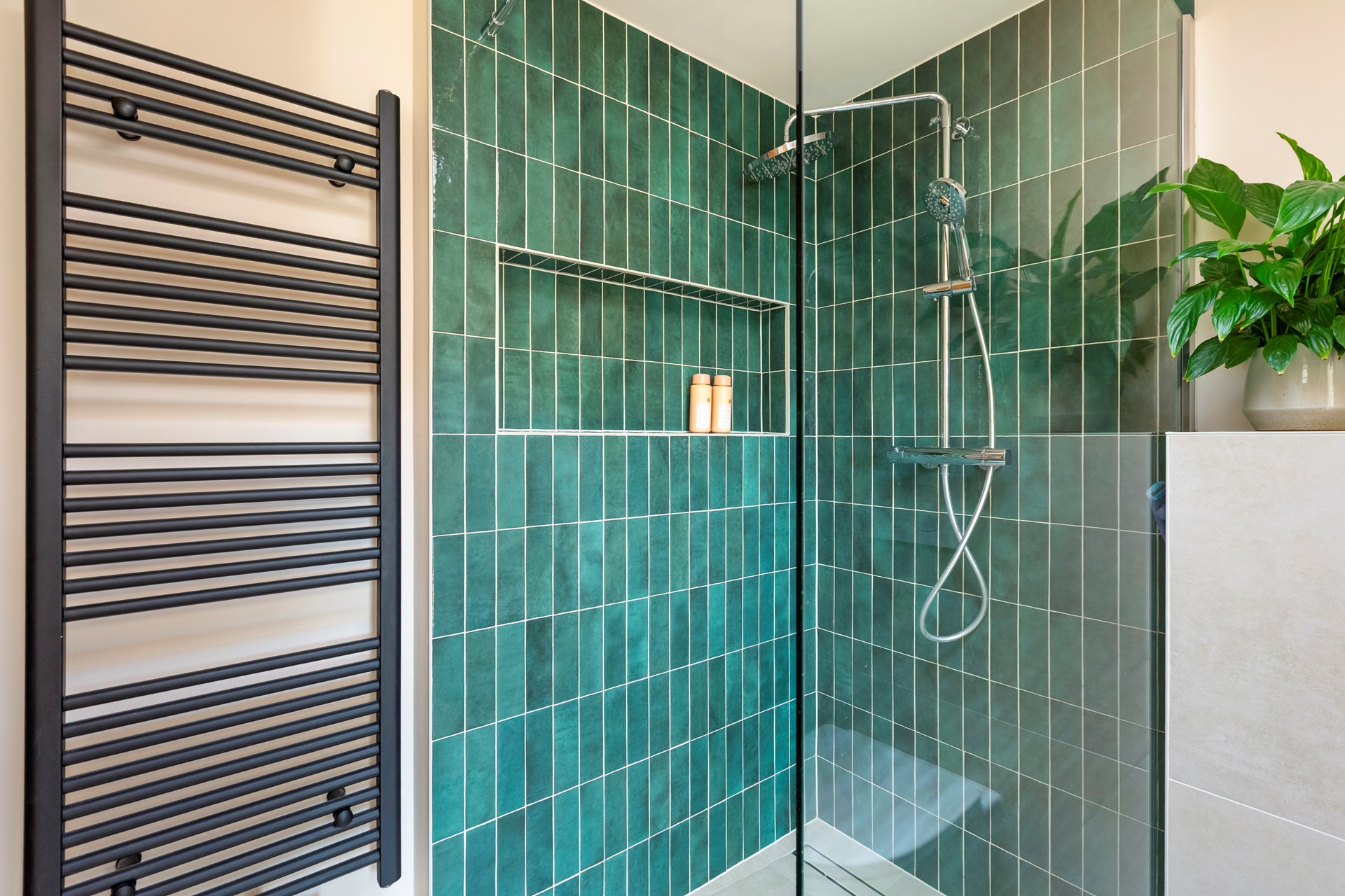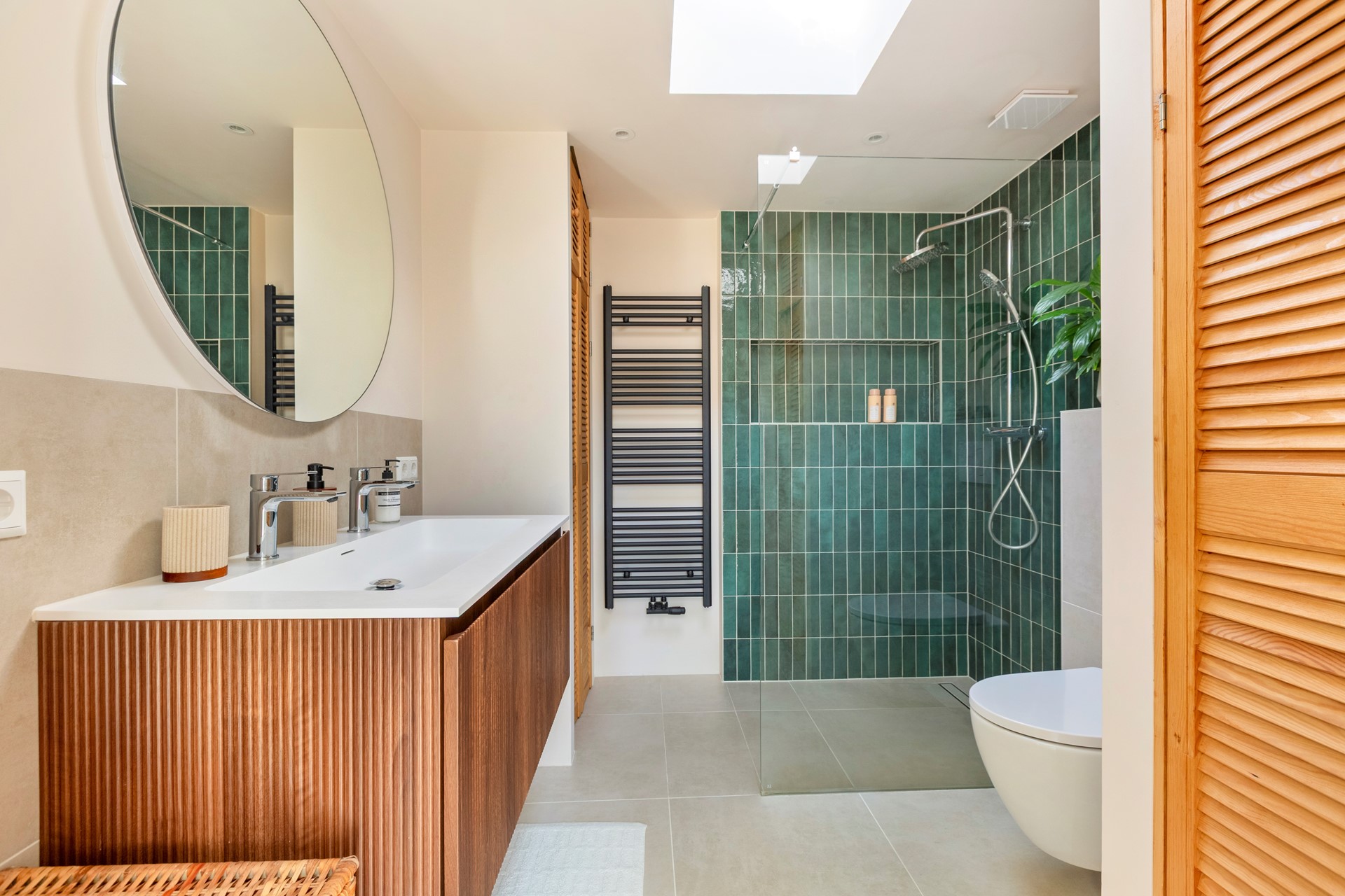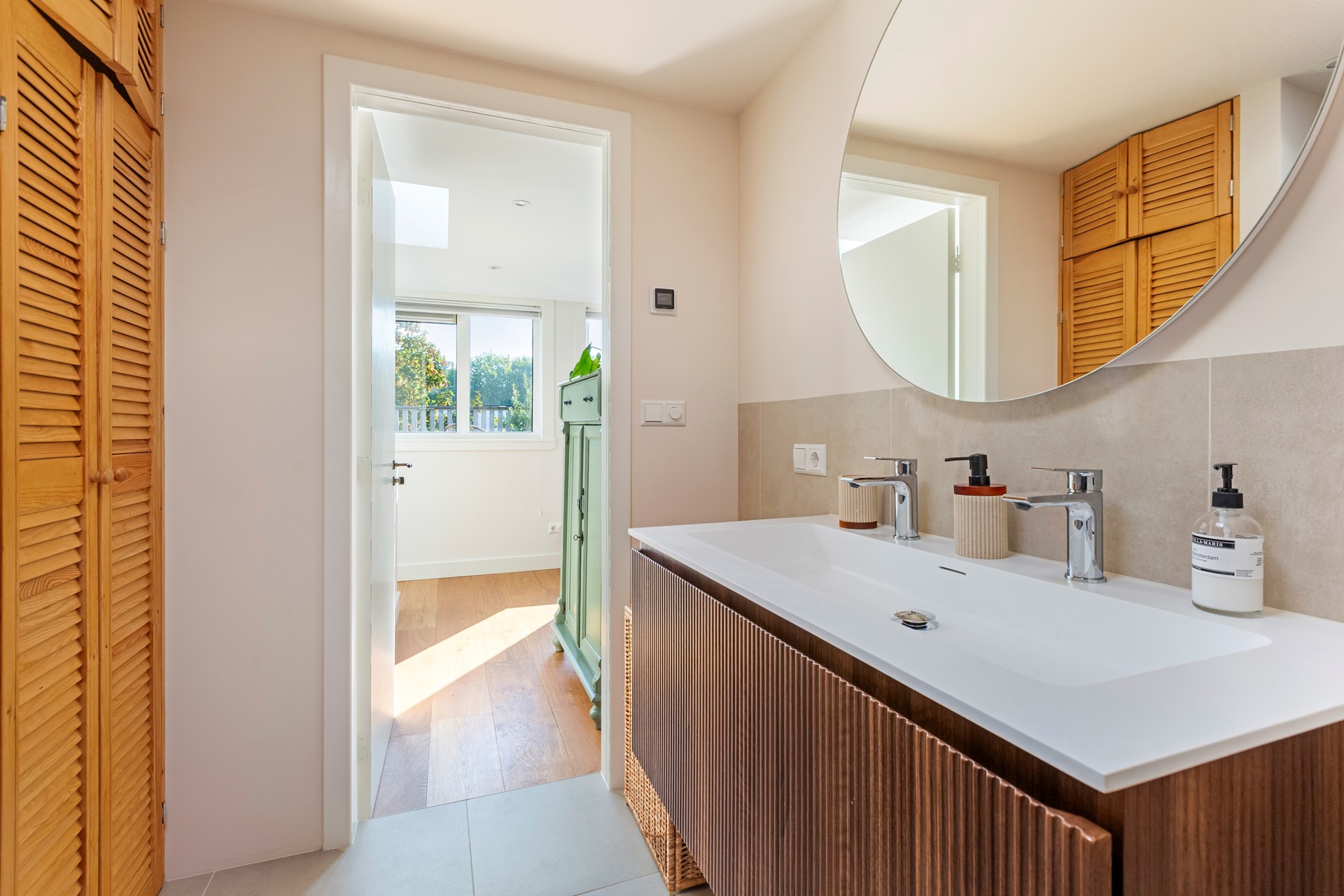 De zeer lichte moderne badkamer is uitgerust met een inloop douche, dubbele wastafel en een toilet. Daarnaast is er een aparte kast met aansluitingen voor de wasmachine en droger.