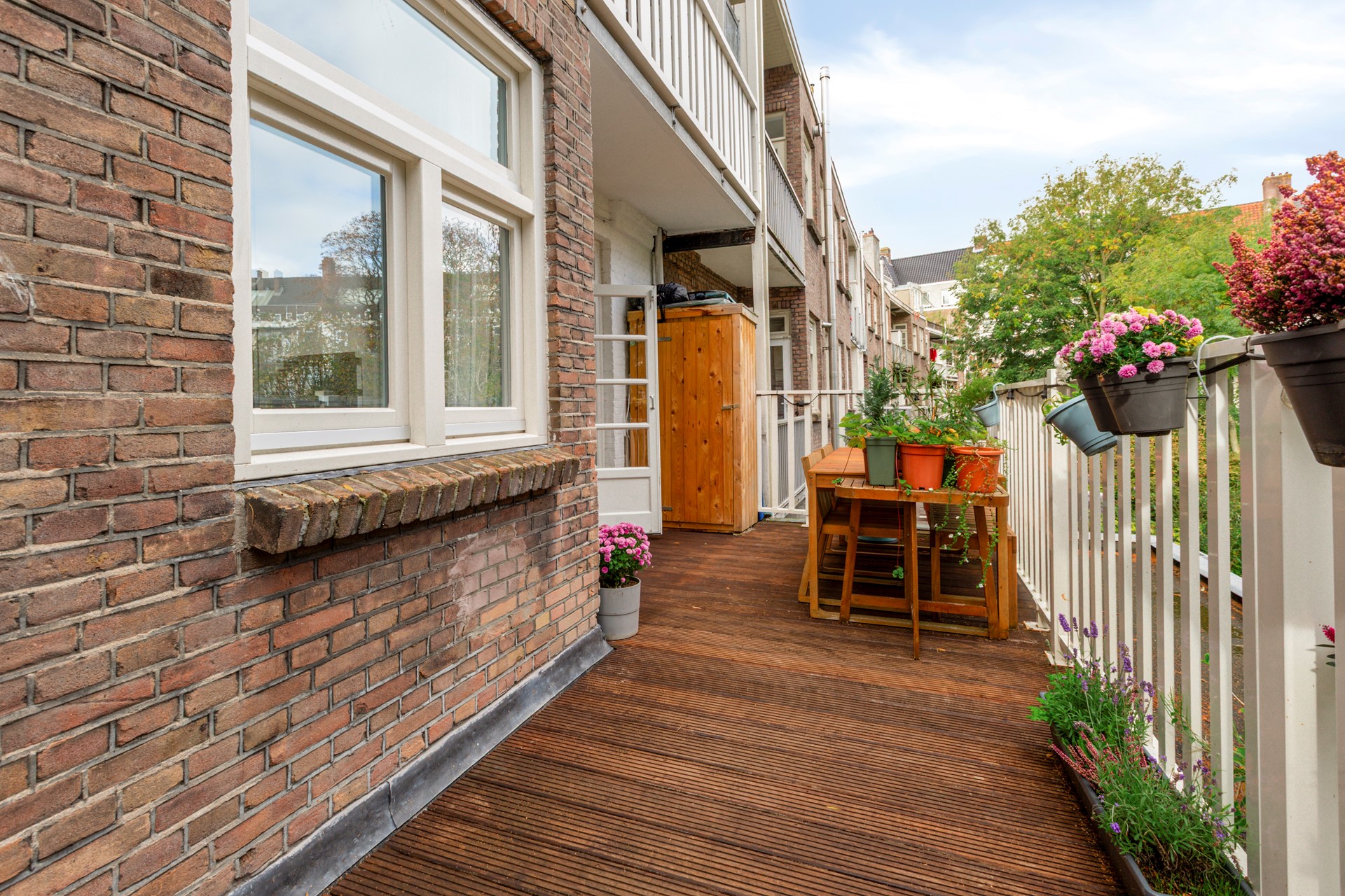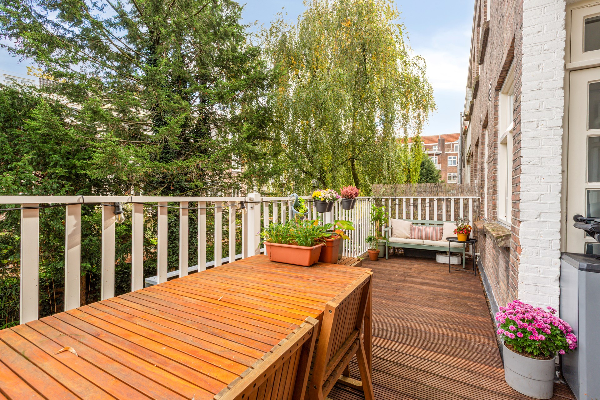 The kitchen is located at the rear of the apartment and is practically and attractively furnished with a straight kitchen layout and ample work and cupboard space. There is plenty of room for a dining area, making this a lovely place to cook and eat together. From the kitchen, you can step onto the spacious roof terrace of approximately 19 m². The terrace overlooks a quiet inner courtyard and is surrounded by mature trees, offering a lot of privacy, especially during the summer months.