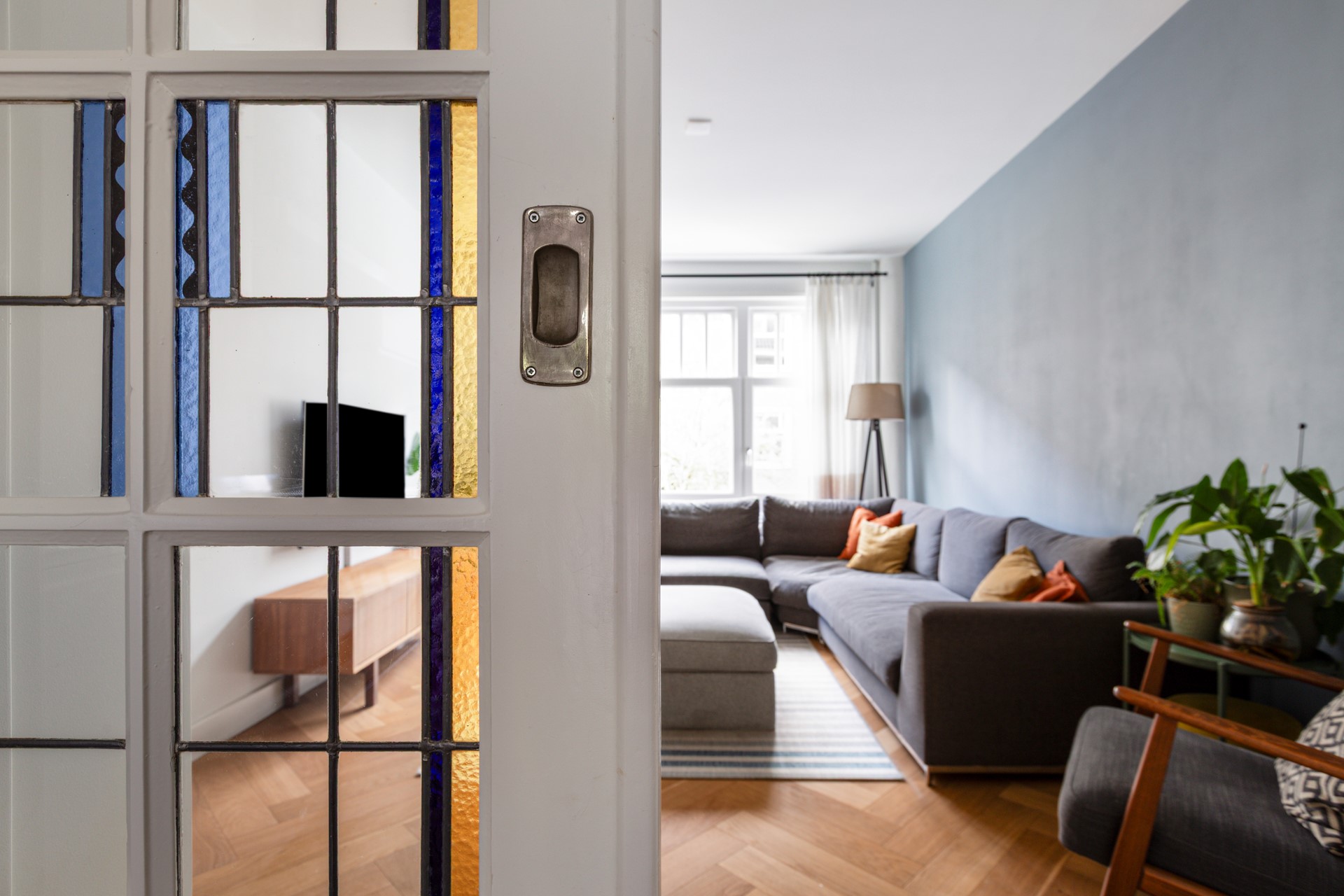 Aan de voorzijde van het pand bevindt zich de lichte en ruime woonkamer met een prachtige plafondhoogte van ongeveer 2,65 meter en originele openslaande deuren met kleurrijke glas-in-loodpanelen die in verbinding staan met de keuken en de eetkamer. Dankzij de brede ramen kun je hier genieten van veel daglicht en is er voldoende ruimte voor een comfortabele zithoek.