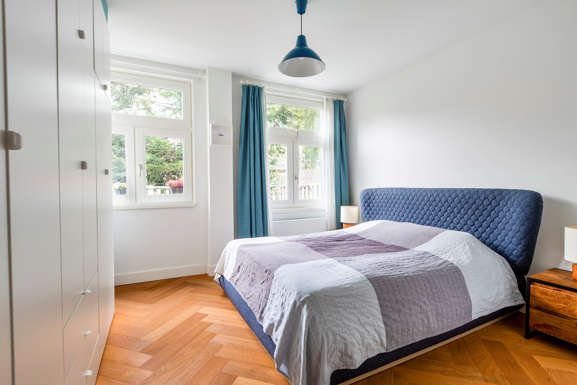 De hoofdslaapkamer bevindt zich ook aan de achterzijde, met directe toegang tot het terras. Deze kamer is ruim en biedt voldoende plaats voor een tweepersoonsbed en een kledingkast.